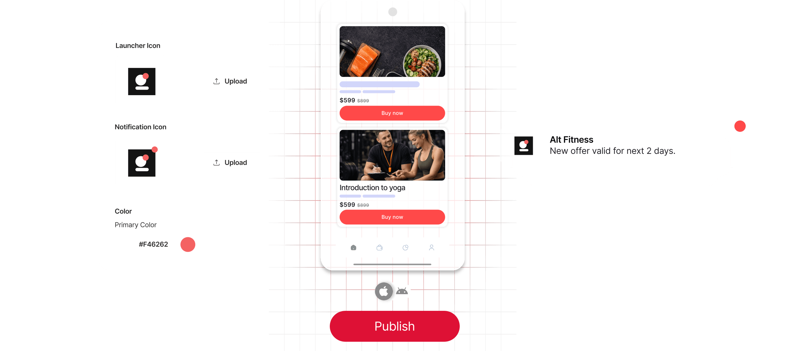 Your app goes live in the iOS App Store and Google Play Store under your own brand.